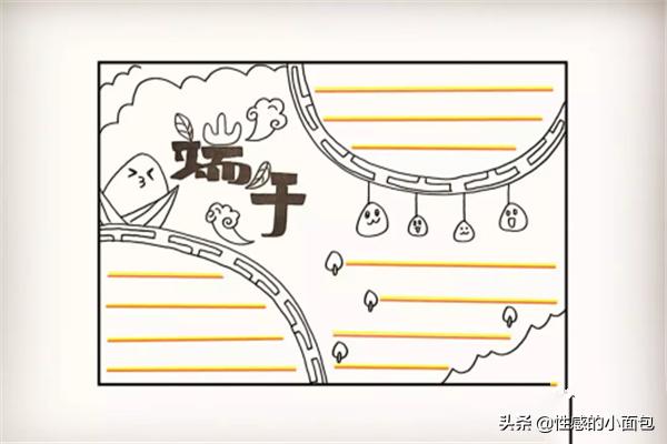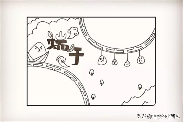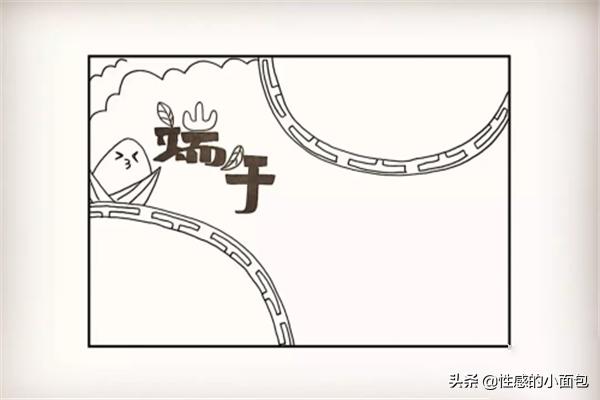 4在主题的旁边画出一个粽子给它加上表情。用波浪线画出主题上方的云朵。