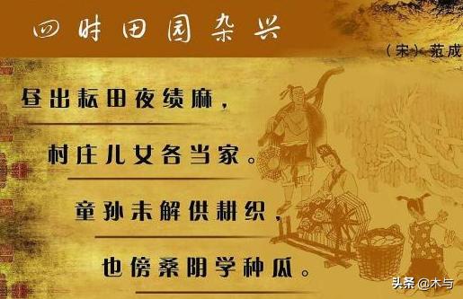 3.《四时田园杂兴》宋·范成大昼出耘田夜绩麻,村庄儿女各当家。童孙未解供耕织,也傍桑阴学种瓜。解释:白天锄地,夜晚搓麻,农家男女都帮着父母做事,干家务,让父母休息。小孩子哪里懂得种田织布之事,也学着大人在桑树阴下种瓜。