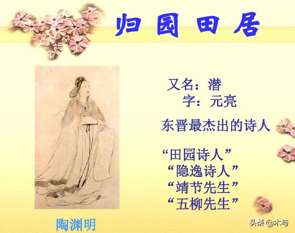 2.《归园田居》东晋·陶渊明种豆南山下,草盛豆苗稀。晨兴理荒秽,带月荷锄归。道狭草木长,夕露沾我衣。衣沾不足惜,但使愿无违。解释:南山下田野里种植豆子,结果是草茂盛豆苗疏稀。清晨起下田地铲除杂草,暮色降披月光扛锄回去。狭窄的小路上草木丛生,傍晚时有露水沾湿我衣。身上衣沾湿了并不可惜,只愿我不违背归隐心意。