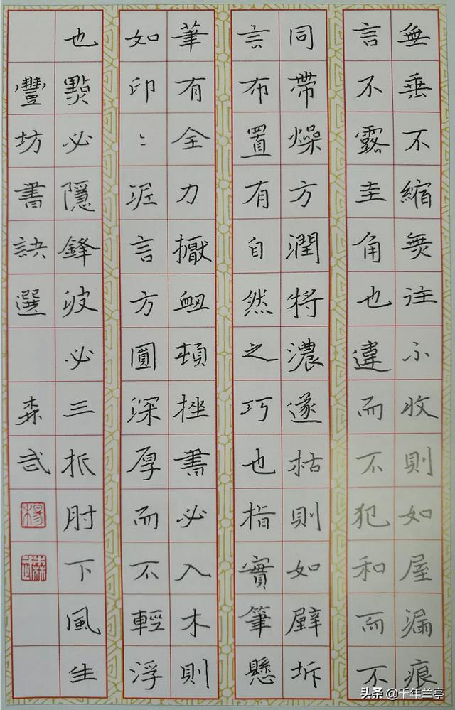 学习硬笔书法有个小窍门,可在学习硬笔的同时,学习一点毛笔书法,其用意在于通过毛笔柔软的笔头,来加深对笔法的理解,可以大大提高硬笔的学习效率。