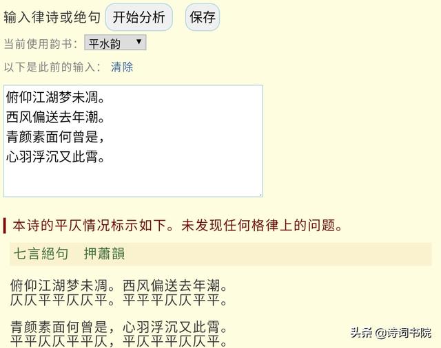 虽然电脑检测非常方便,但我还是建议在进行电脑检测前,尽可能先自己进行人工校验,这有利于我们熟悉律句句式和寻找句感,也可以让我们的写作逐步与律句接近,最终达到成句即律句。而过度依赖电脑检测,则很难获得进步。