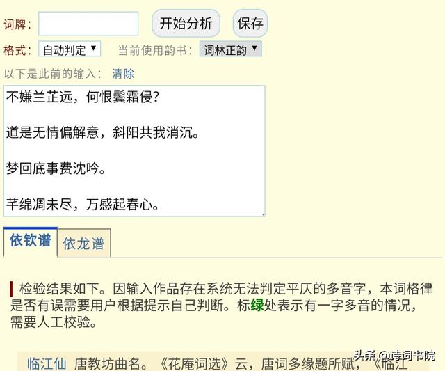 词是依词谱而填。只要是依常规的词谱(如《钦定词谱》)而创作,仍可以在上述平台进行词律检测,方法也同样简单方便。直接把作品贴在相关的输入框,依创作选择《词林正韵》或《新韵》即可进行校验,系统会自动识别词谱,其他的和格律诗的平仄检测相同。