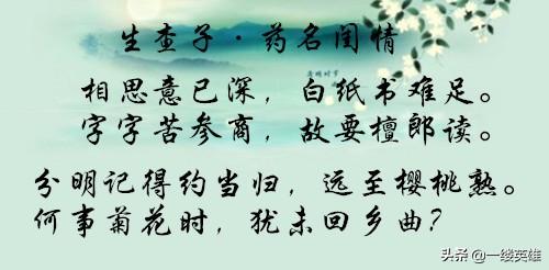 正如词中小序写的那样,这是一首“药名闺情”的词,也就是一首以药名写成的词。既然是“药名词”,按照词作要求:每句中至少要有一个药名,而药名也可以借用同音字来表达,这才不失位一首合乎规范的“药名词”。