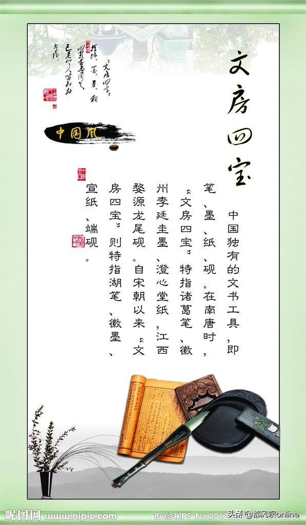 诚谢邀答:文房四宝一一一笔,墨,纸,砚。是古代传统的书写绘画之工具。凝聚了古人智慧后结晶。文房四宝一名起源于魏晋南北朝时期(公元420一589年)。北宋时期苏易简著《文房四谱》一名《文房四宝谱》。时至今日仍然是书画家及爱好者目中珍物。