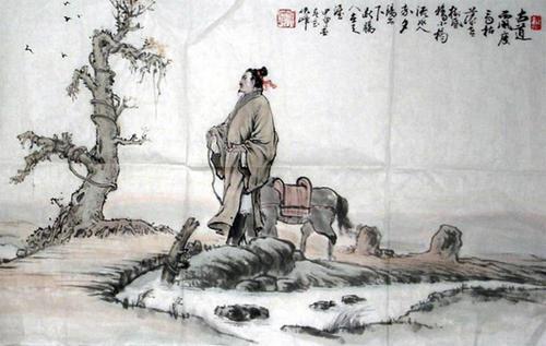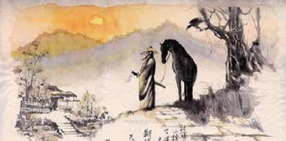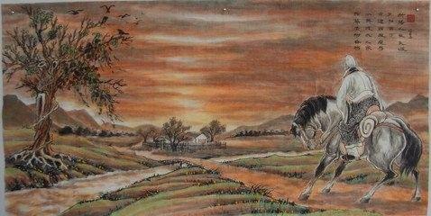 荒凉的古道上,迎着西边吹来的萧瑟的秋风走来一位骑着瘦马的游子.