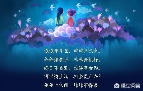 这首诗借神话传说中牛郎、织女被银河相隔而不得相见的故事,抒发了因爱情遭受挫折而痛苦忧伤的心情。诗一开篇,先写织女隔银河怅望对岸的牛郎。“迢迢”是织女心里的感觉,情人眼里的咫尺天涯。牵牛郎,既是“河汉女”眼中的牛郎,也是“河汉女”心中的牛郎。这第一句是立足织女的感觉来写,第二句才正面写织女。这一二句诗就为后文的种种场面描写、情思描写而张了本。“皎皎河汉女”是写景也是写人。“皎皎”不仅写出了银河的清亮,也是为后文的“清且浅”做铺垫,同时也写出了织女整体形象的娇美姿态。