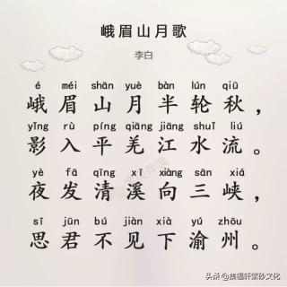 这首诗的第一句是:峨眉山月半轮秋。意思是秋天的夜晚,在峨眉山上的天空中有半轮明月。其中有峨眉山,有秋,有月,还要体现出“半”月,用七个字来写并不容易。