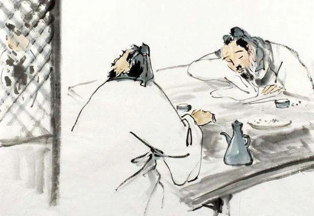 白居易安闲地坐着,面前摆着一个小火炉,炉子里火苗跳跃着,壶里冒着热气。