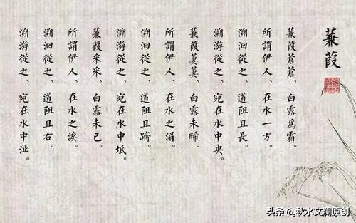 蒹葭苍苍,白露为霜。所谓伊人,在水一方。溯洄从之,道阻且长。溯游从之,宛在水中央。